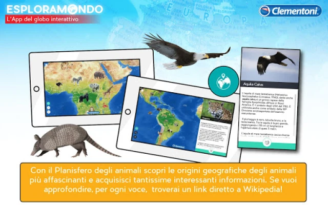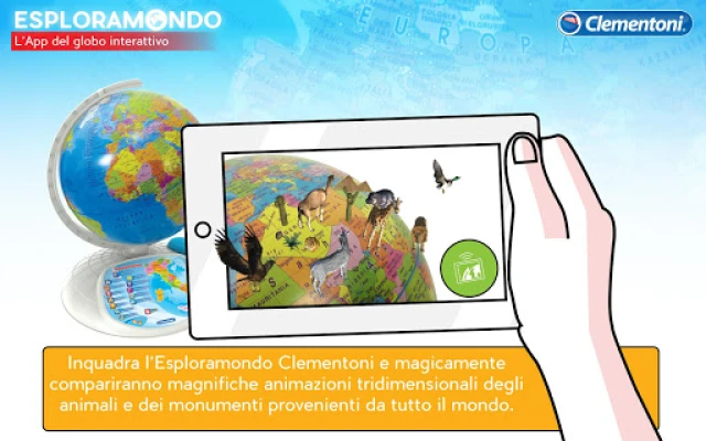 Η εφαρμογή Esploramondo εμπλουτίζει την εμπειρία του Esploramondo Clementoni για ενήλικες και παιδιά 7+. Εξερευνήστε τον κόσμο με 3 τρόπους: επαυξημένη πραγματικότητα για 3D ζώα και μνημεία, πλανισφαίριο με πληροφορίες και σύνδεσμους Wikipedia, και διασκεδαστικά κουίζ για να γίνετε κορυφαίος ταξιδιώτης. Μάθετε και διασκεδάστε ανακαλύπτοντας τον πλανήτη!