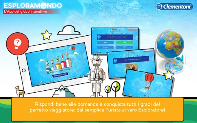 Δοκιμάστε τις γνώσεις σας και γίνετε ο απόλυτος εξερευνητής μέσω του διασκεδαστικού Παιχνιδιού Ερωτήσεων! Απαντήστε σωστά στις προκλήσεις, συλλέξτε πόντους και αναβαθμίστε τον τίτλο σας, ξεκινώντας από τον απλό «Τουρίστα» μέχρι να φτάσετε στον πολυπόθητο βαθμό του «Πραγματικού Εξερευνητή». Κάθε σωστή απάντηση σας φέρνει πιο κοντά στην κατάκτηση της παγκόσμιας γνώσης, ενώ παράλληλα ενισχύει την αγάπη σας για την εξερεύνηση. Η εφαρμογή Esploramondo Clementoni δεν είναι απλώς ένα παιχνίδι, είναι ένα διαβατήριο για έναν κόσμο γεμάτο εκπλήξεις, μάθηση και ατέλειωτη διασκέδαση για όλη την οικογένεια.
