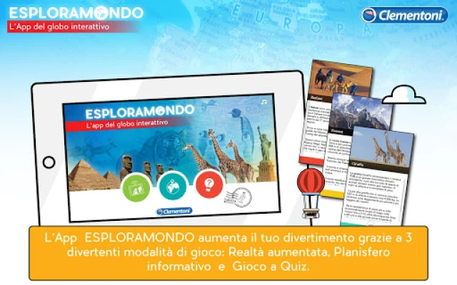 Ετοιμαστείτε για ένα συναρπαστικό ταξίδι γνώσης και διασκέδασης που απευθύνεται σε όλες τις ηλικίες, από 7 ετών και άνω! Η εφαρμογή Esploramondo Clementoni μεταμορφώνει τον τρόπο που εξερευνάτε τον κόσμο, προσφέροντας μια μοναδική εκπαιδευτική εμπειρία. Ανοίξτε νέους ορίζοντες στο παιχνίδι και τη μάθηση, με τρεις διαδραστικές λειτουργίες που εγγυώνται ατελείωτες ώρες ανακάλυψης: την επαυξημένη πραγματικότητα, τον παγκόσμιο χάρτη και το συναρπαστικό παιχνίδι ερωτήσεων.